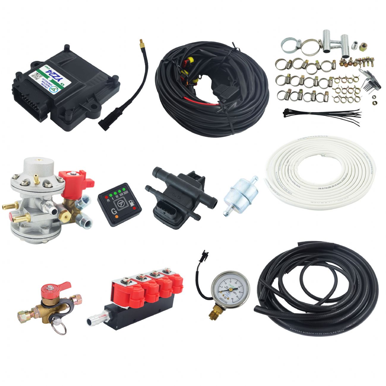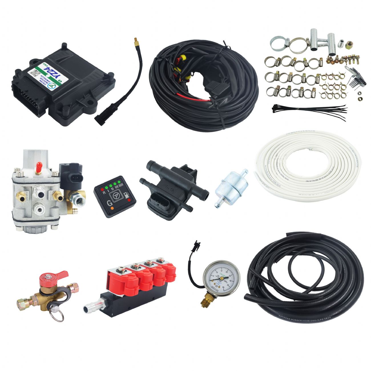 YZ24 OBD Autogas conversion system includes YZ24 OBD ECU control unit, change-over switch, wiring harness, gas pressure sensor, temperature sensor, regulator, injectors rail, filling valve, filter, high pressure pipe, pressure gauge, gas pipe, bag of accessories, etc.